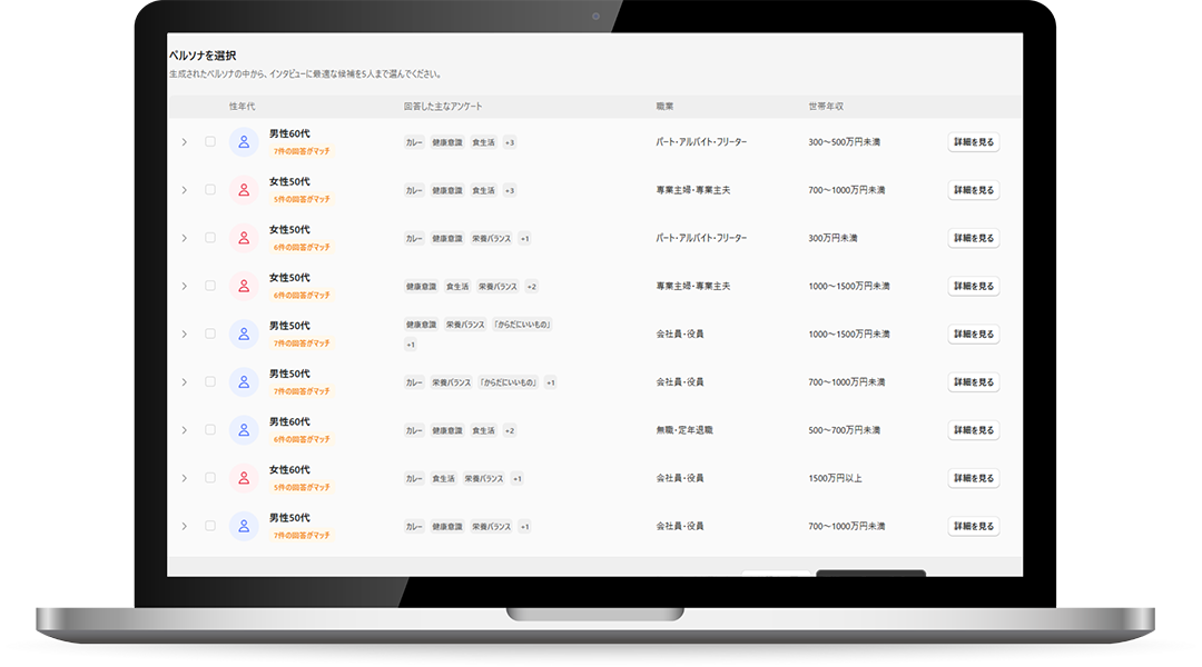 架空ではないリアルな生活者像から、信頼性のあるインサイト発見や具体的なアイデア創出につながるインタビュー調査がいつでもすぐに行えます。