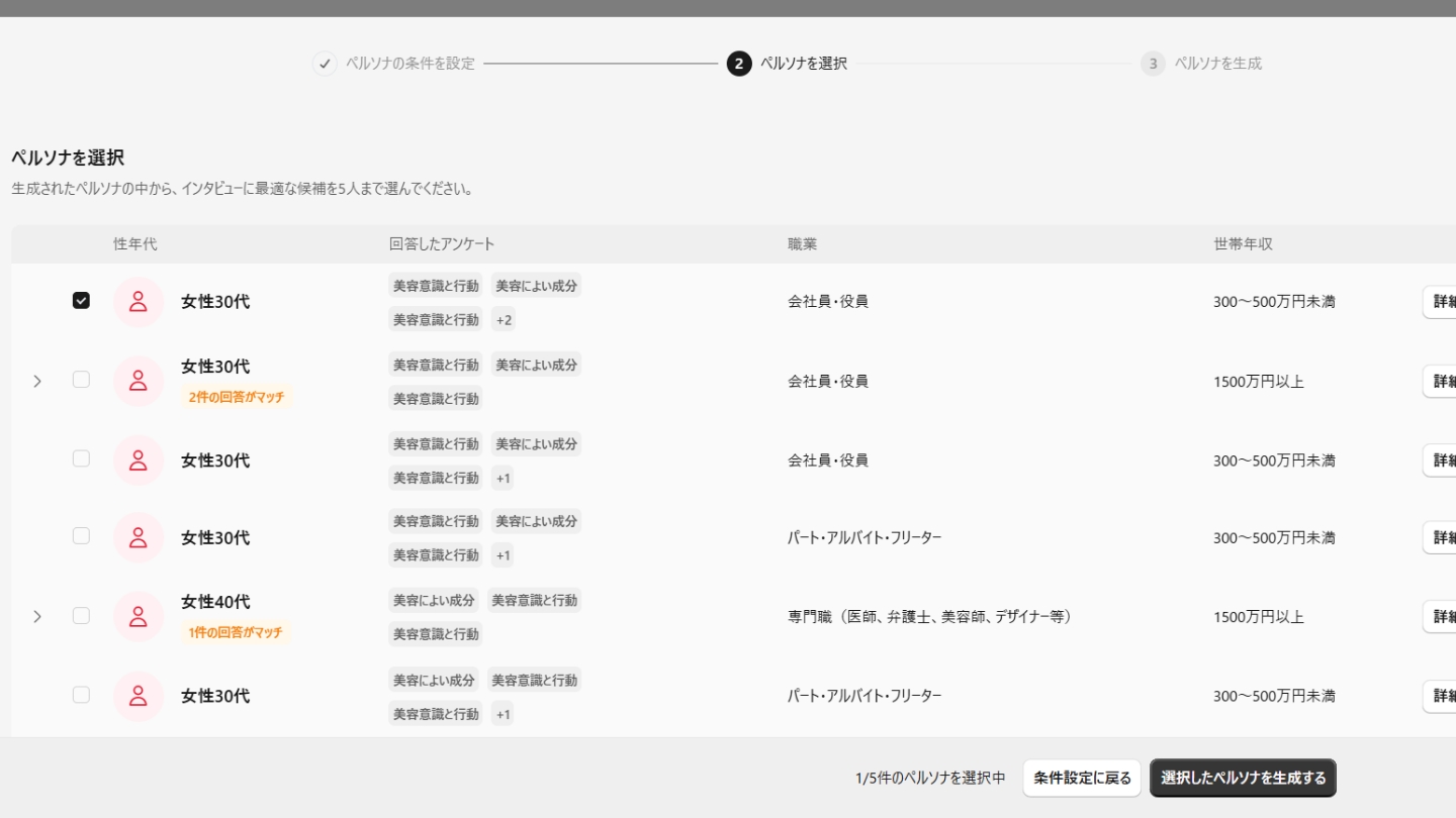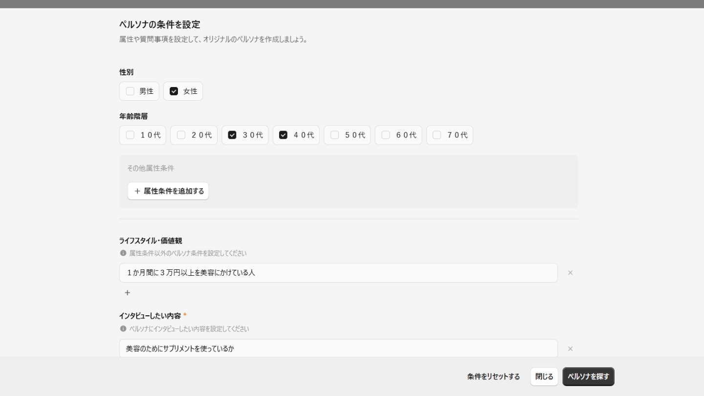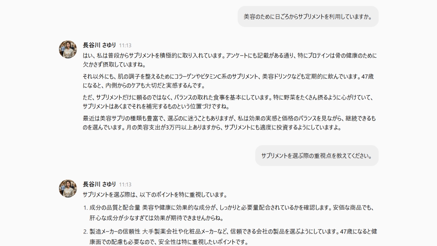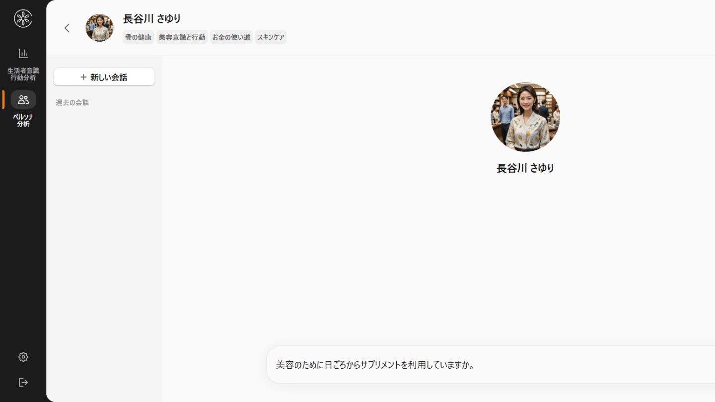 モニターの18項目の属性情報(性年代・年収・居住地など)と、過去に答えた多ジャンルのアンケートデータをもとに、AIが実在する個人の n=1ペルソナを生成。