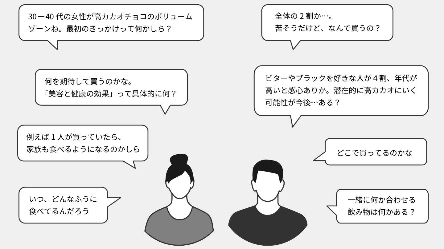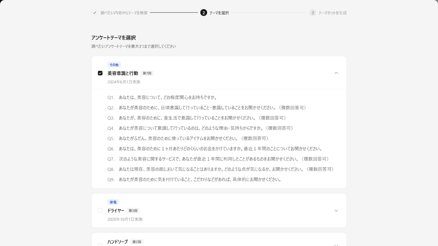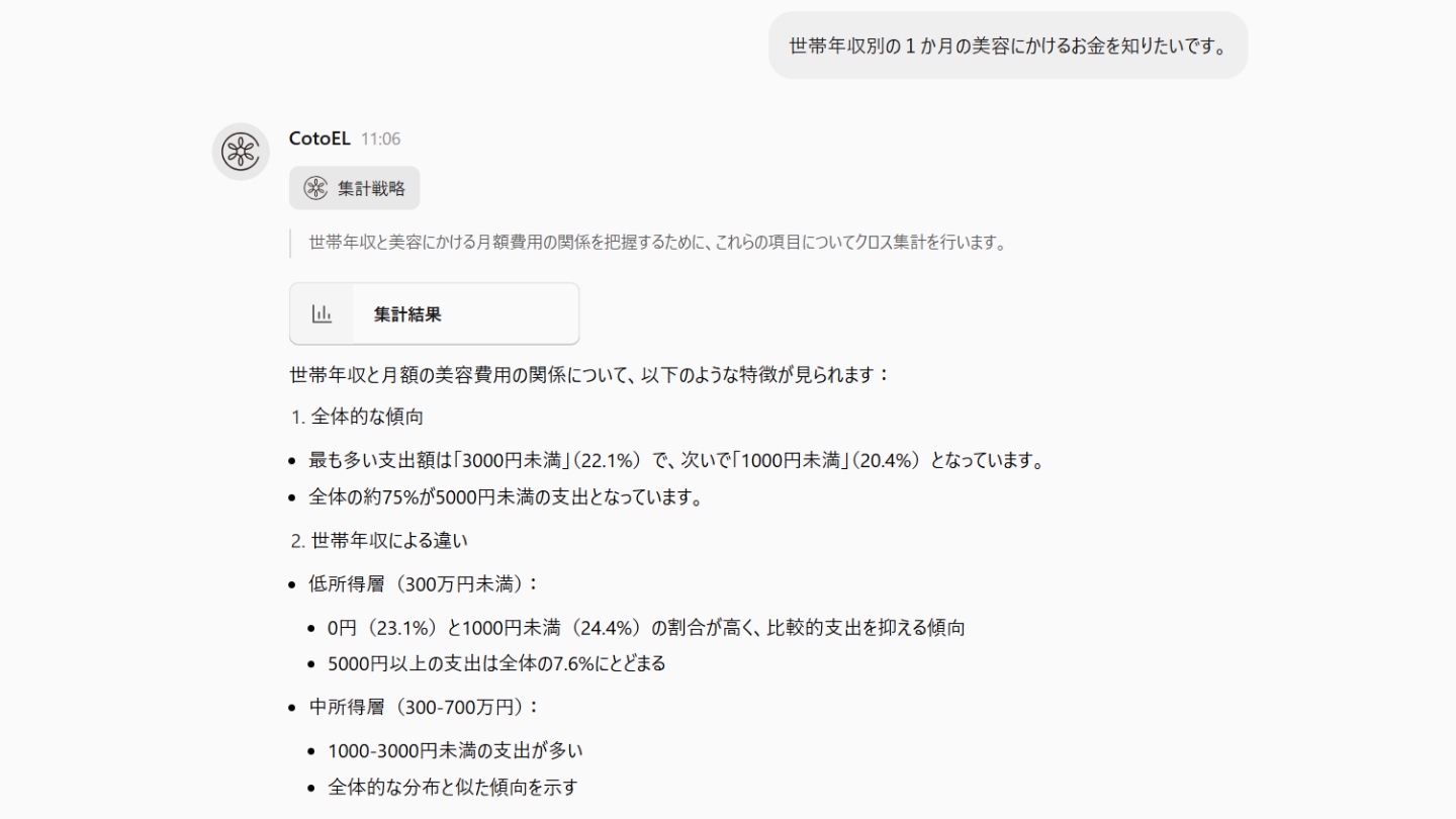 2,400万のアンケートデータベースから、あなたの質問に関連したアンケートをAIが抽出。集計結果の自動生成・要約や、マーケティング施策の示唆出しまで行います。また、2つのアンケートを組み合わせた分析により、新たな仮説や生活者ニーズの発見に役立ちます。