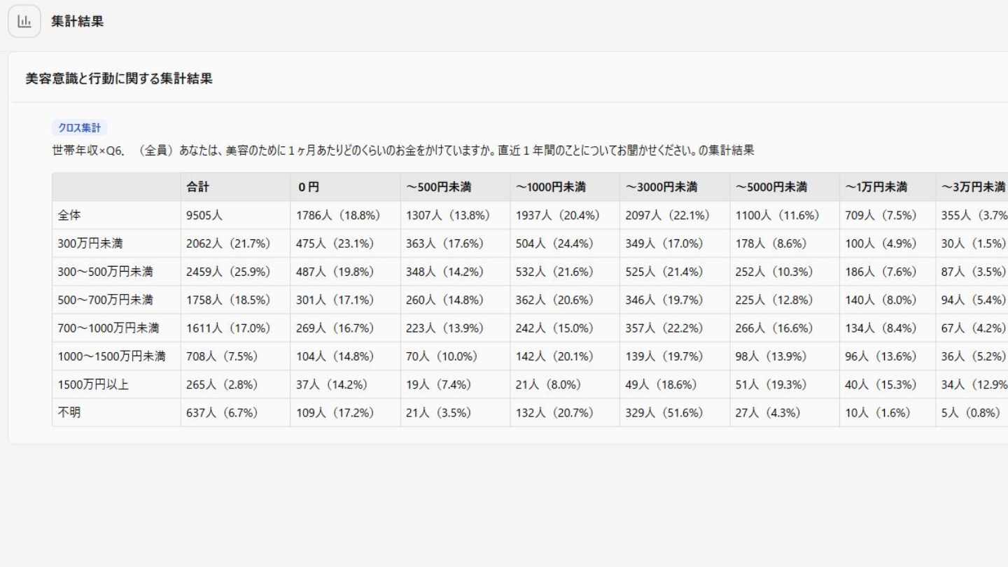 単純集計・クロス集計だけでなく、属性を絞った集計も可能です。集計結果に基づくマーケティング分析も見られます。